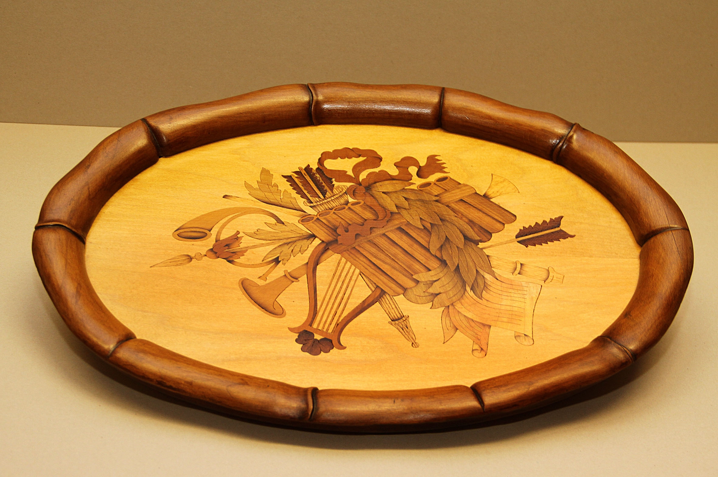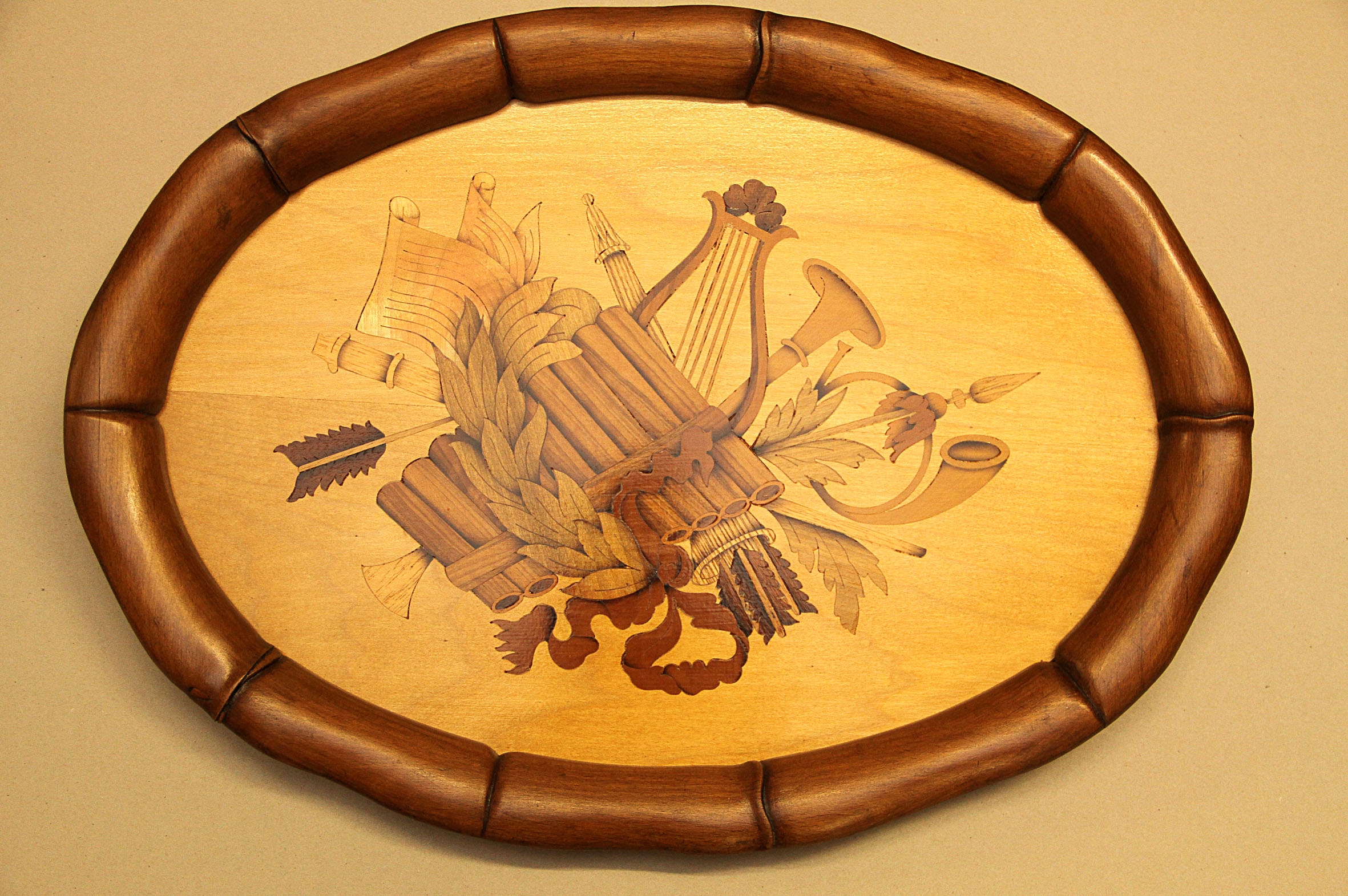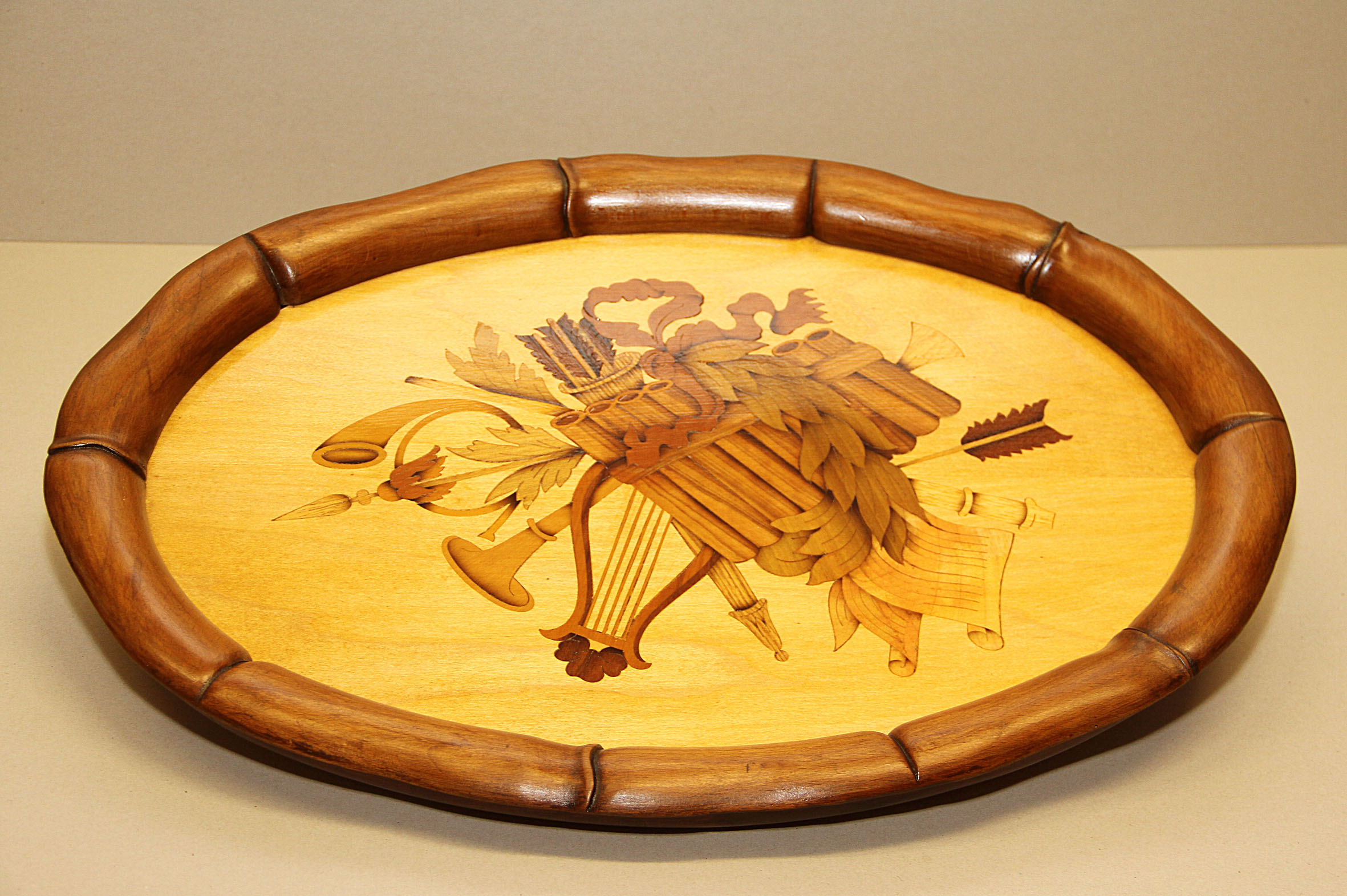 Vassoio in legno intarsiato con varie essenze di legno. La cornice esterna è in legno intagliato. La parte inferiore è rivestita in panno.Le dimensioni sono di cm.51 x 27.