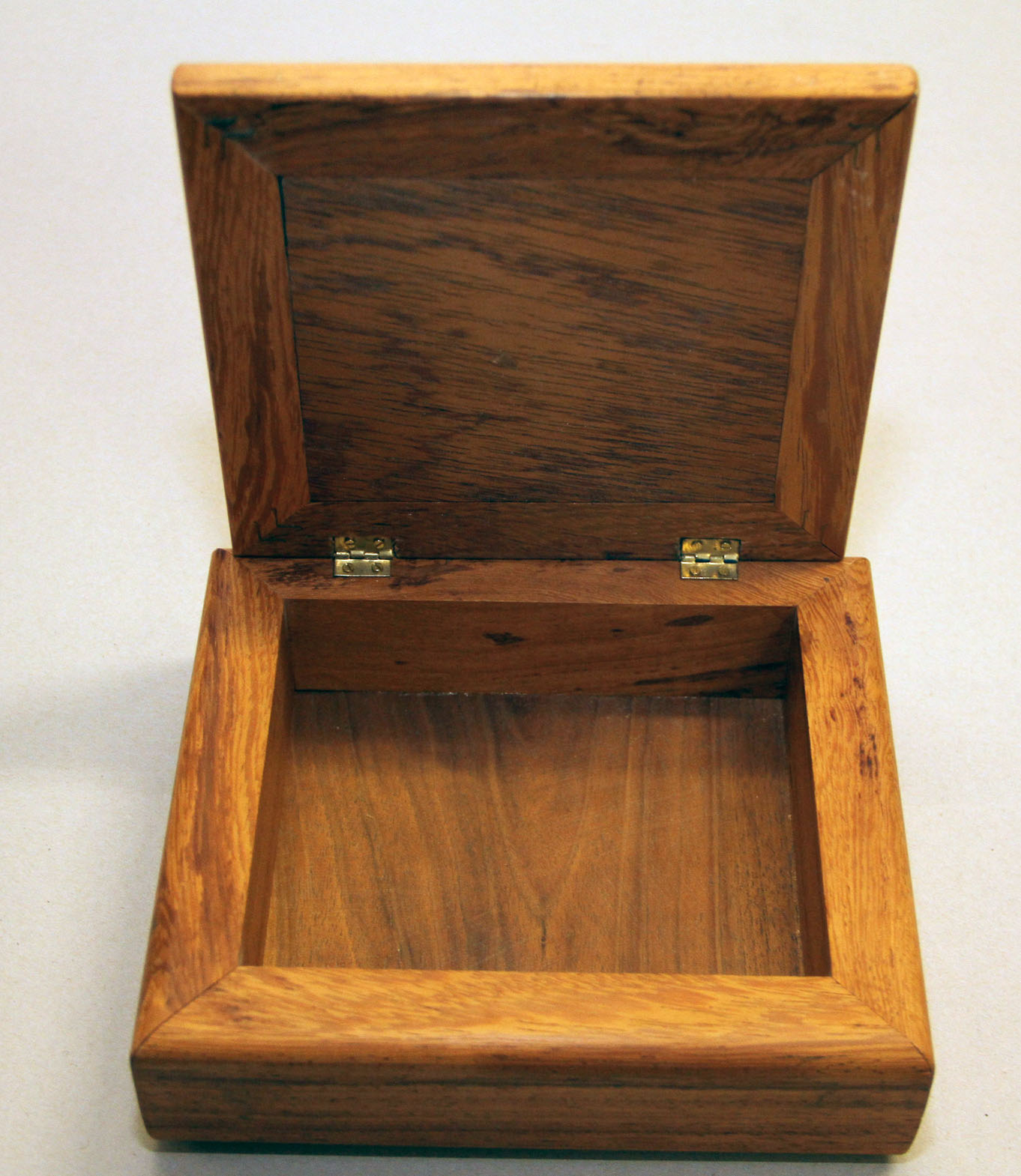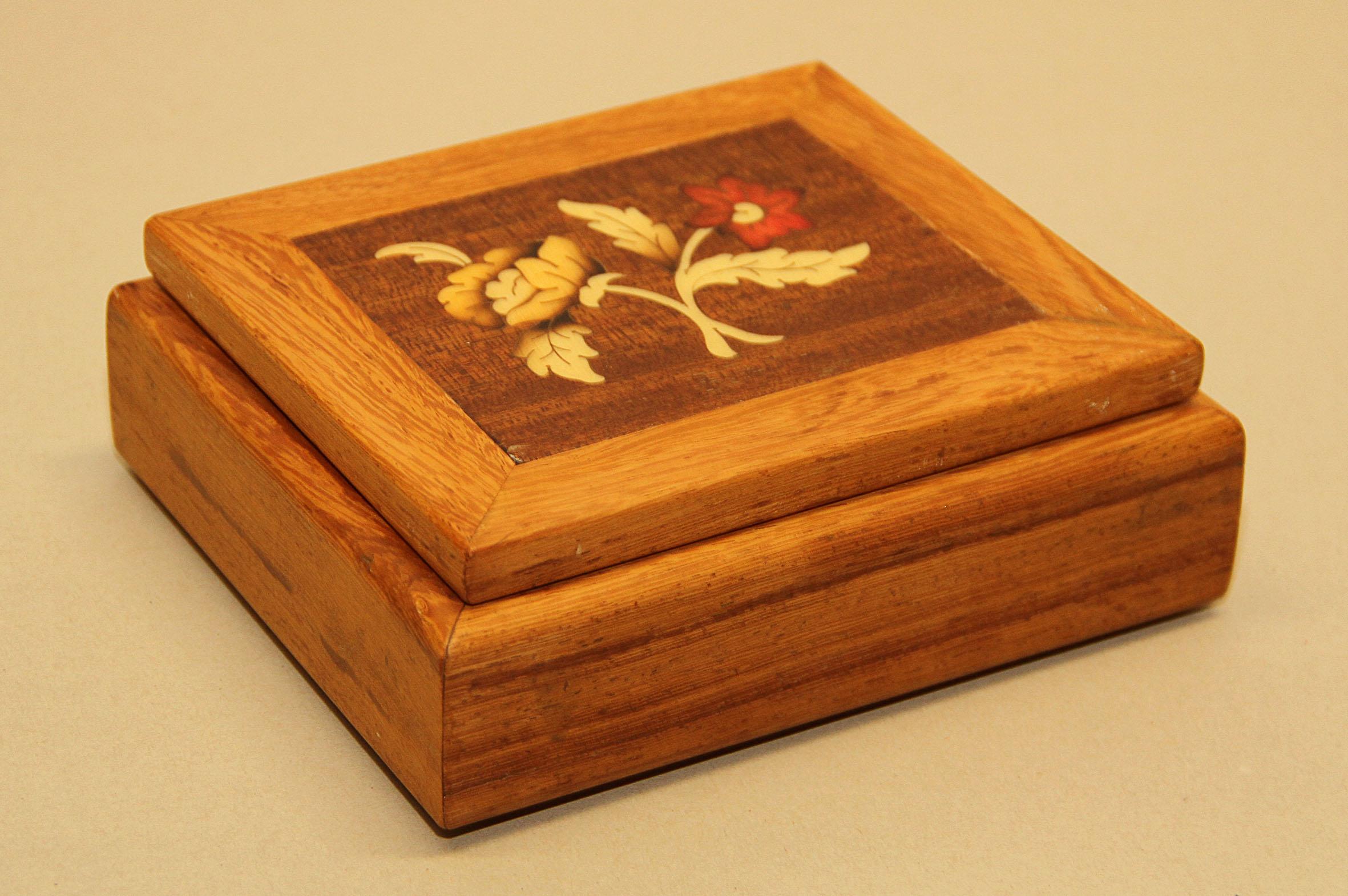 Scatola in legno massello esotico (paduka) ed intarsio in legno a motivo floreale sul coperchio. L'interno è lucidato ma lasciato con legno "a vista" per dare risalto alle venature. Il lato inferiore è rivestito in panno. Le dimensioni sono di cm.18 x 16 l'altezza è di cm. 6. Tutti i prodotti artigianali della Galleria Tettamanti sono eseguiti utilizzando legni trattati di produzione italiana. Le vernici e le colle utilizzate sono di origine naturale. Le finiture sono in gommalacca e cera. Ogni pezzo è rifinito singolarmente e le disponibilità sono limitate. La sicurezza di acquistare un oggetto che ha tutte le caratteristiche del "pezzo unico" , il tutto contraddistinto da un prezzo "controllato" proprio perchè produzione e vendita avvengono senza intermediari.