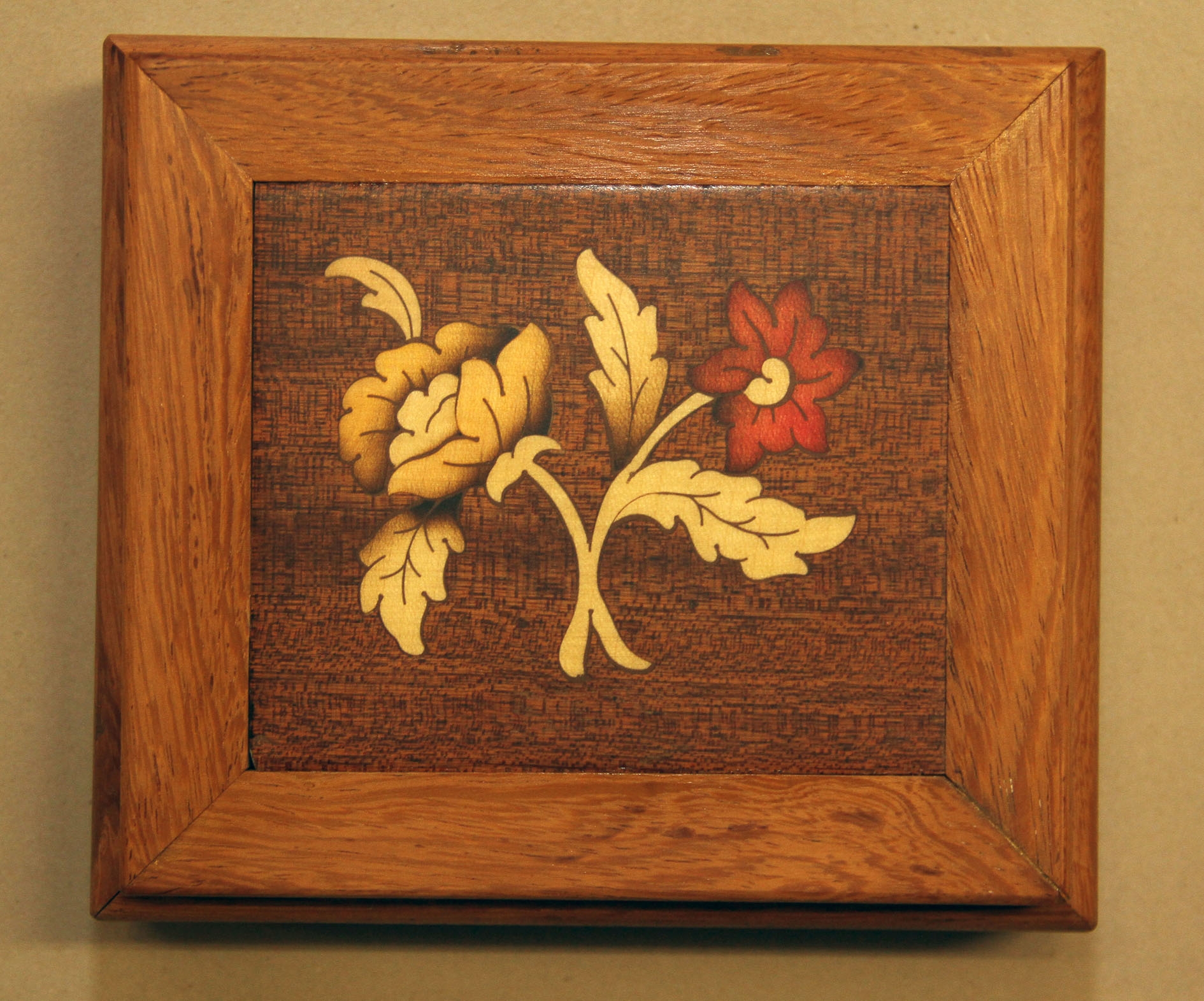 Exotic solid wood box (paduka wood) and floral motif inlay on the lid. The interior is polished but left with "exposed" wood to emphasize the grain. The lower side is covered in cloth.
