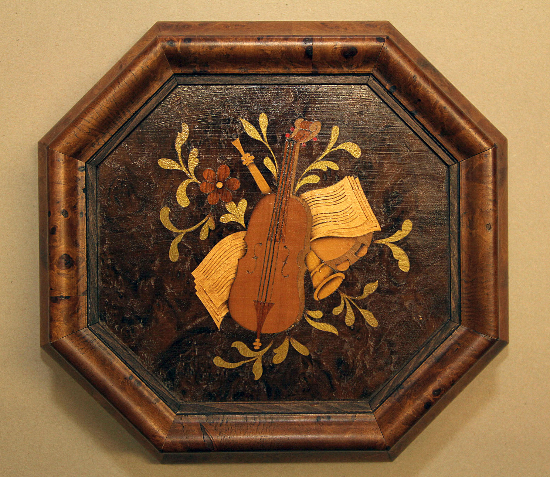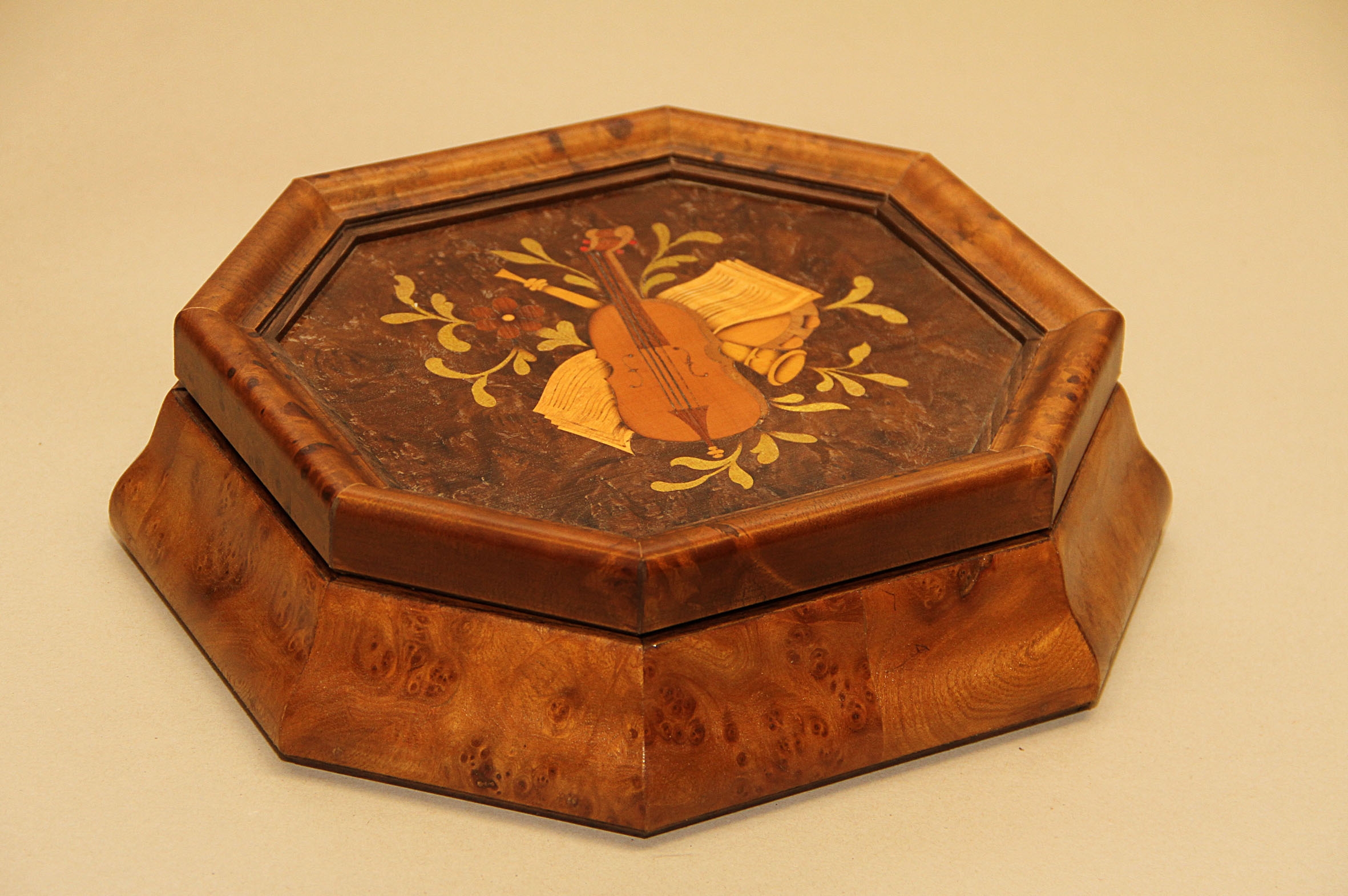 Scatola in radica di olmo con intarsio in legno a motivo musicale sul coperchio.L'interno è rivestito con alcantara verde effetto "vintage". La parte inferiore è rivestita in panno. Le dimensioni sono cm.26 x 24 l'altezza è di 8 cm. Tutti i prodotti artigianali della Galleria Tettamanti sono eseguiti utilizzando legni trattati di produzione italiana. Le vernici e le colle utilizzate sono di origine naturale. Le finiture sono in gommalacca e cera. Ogni pezzo è rifinito singolarmente e le disponibilità sono limitate. La sicurezza di acquistare un oggetto che ha tutte le caratteristiche del "pezzo unico" , il tutto contraddistinto da un prezzo "controllato" proprio perchè produzione e vendita avvengono senza intermediari.