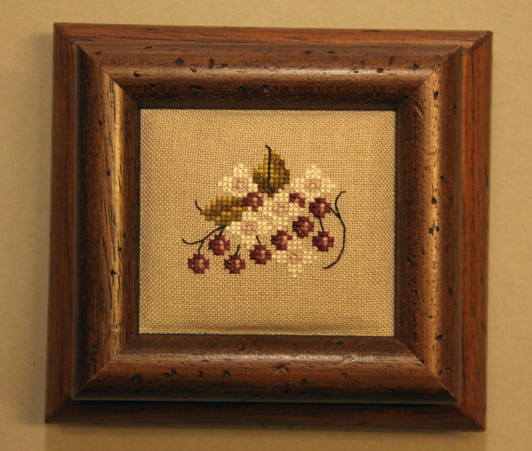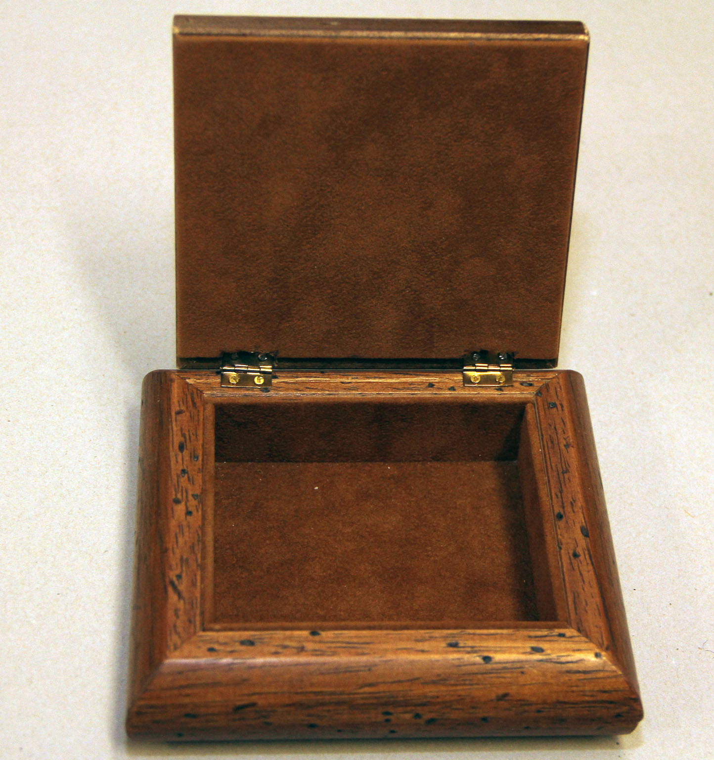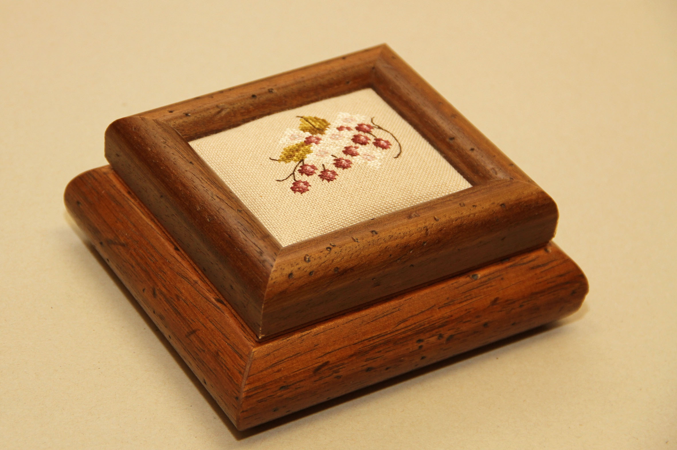 Country wooden box with floral cross-stitch motif on linen inserted in the lid. The interior is covered in brown Alcantara with a "vintage" effect. The linen embroidery on the lid is slightly padded.