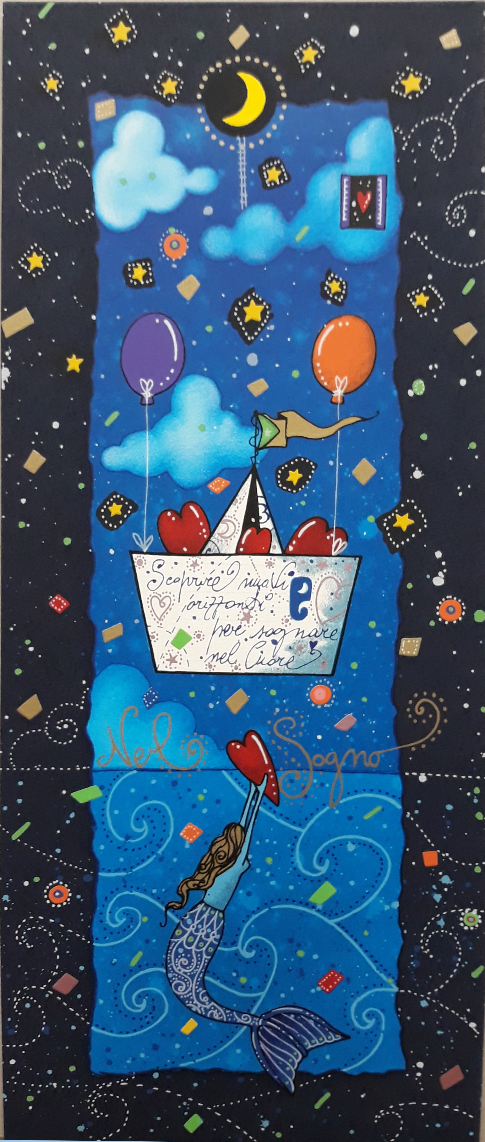 In questo spazio infinito dove è possibile incontrare incredibili balene-aquilone, angeli funanboli, timidi marinaretti, "frammenti dì stelle" bagnati dalla luna, lo spettatore si perde, ritrovando per un istante un attimo di assoluta serenità.... Questo è lo scopo finale delle comunicazioni" di Agostini.