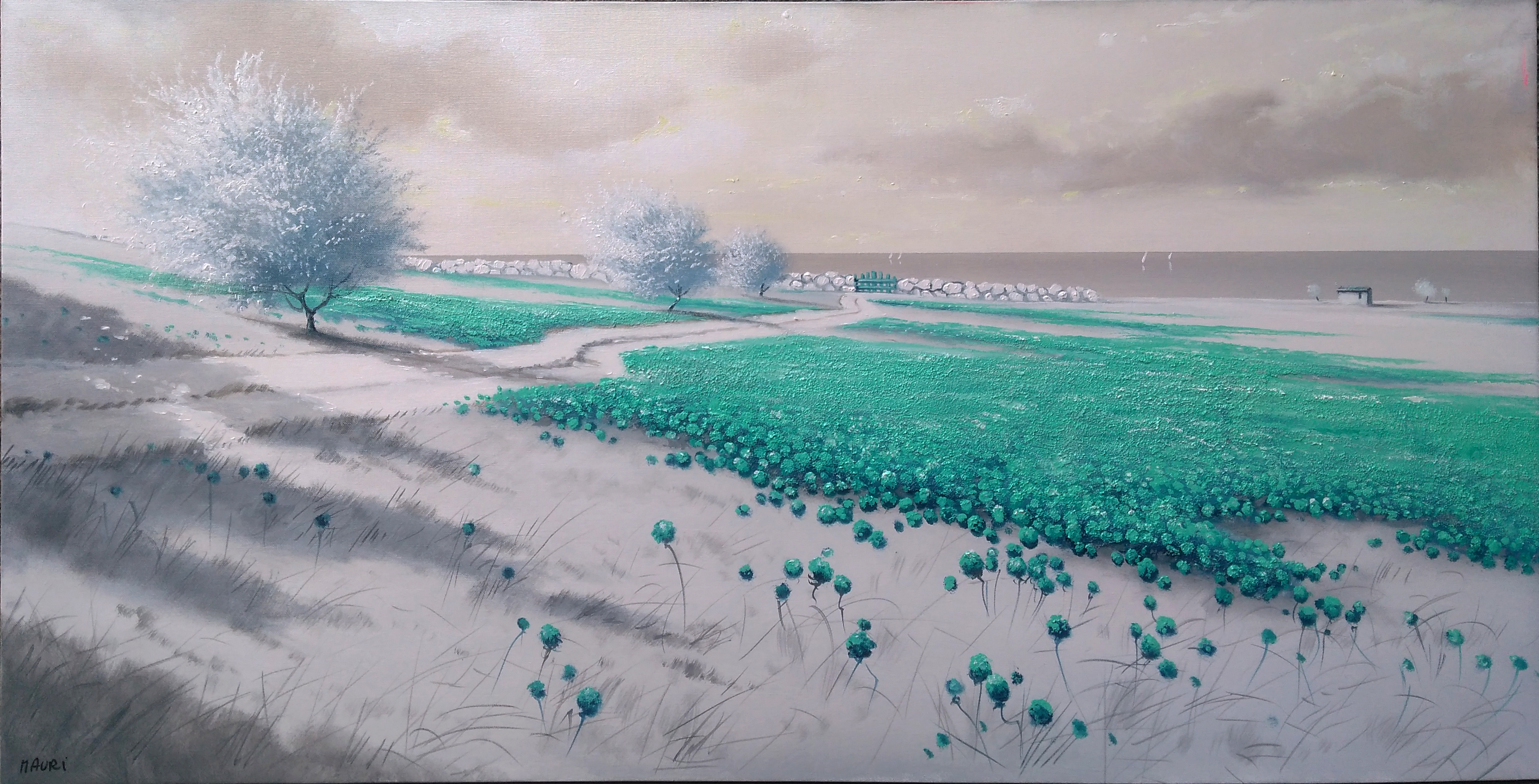 Questa esperienza lo porterà ad affinare una sua personale tecnica di pittura minimalista, fatta di colori intensi e cromatiche fluorescenze, con le quali crea paesaggi dal sapore poetico che rendono partecipe lo spettatore.