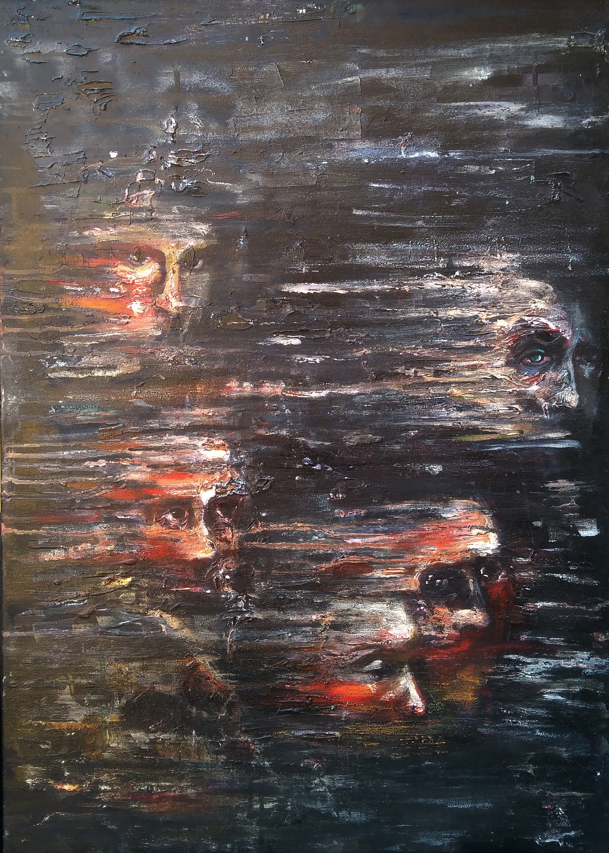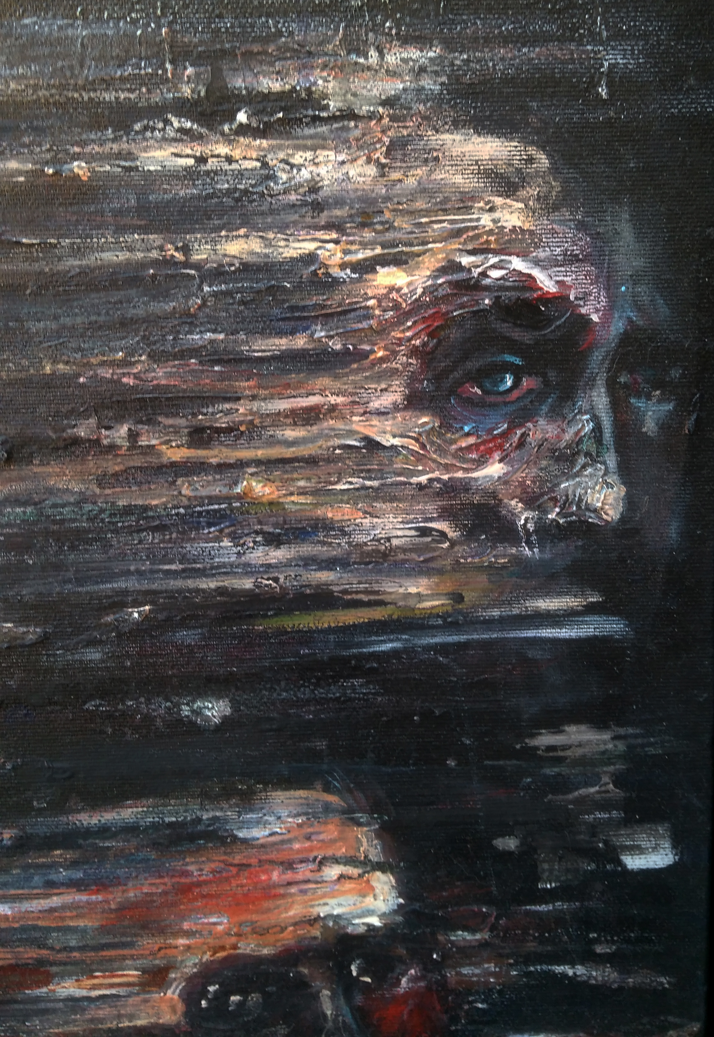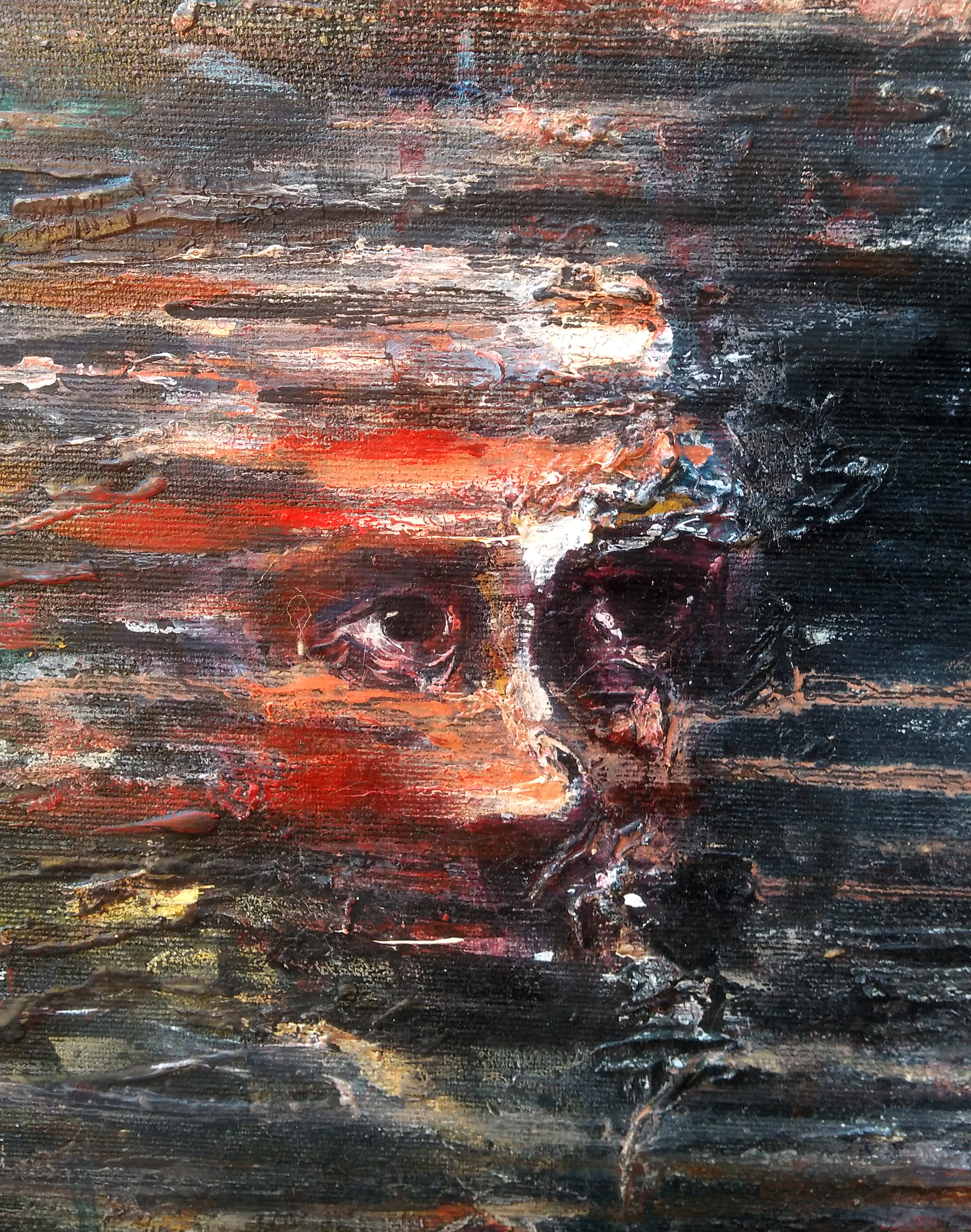 Un volto antico si origina da un tronco verticale, reso da densi colori colanti. L’occhio vivido ci fissa in una mancata espressione nostalgica di amara consapevolezza. Il tronco, così come il volto dell’uomo, sfuma nel nero dello sfondo, dando l’impressione di essere una visione estrapolata dalla nostra mente e proiettata all’esterno. Un monito recondito che la nostra coscienza ci invita a seguire.