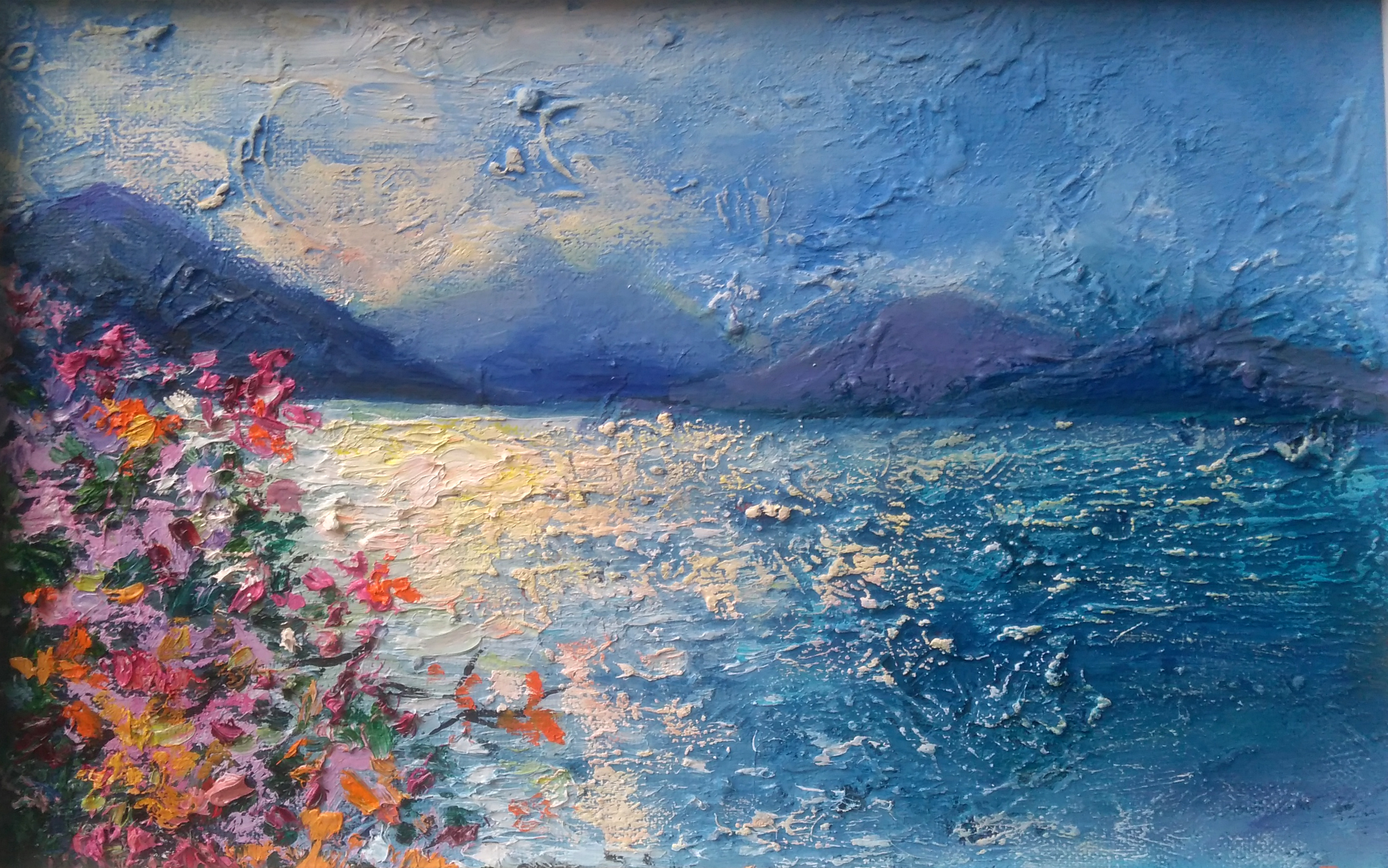 Her landscape paintings appear incandescent, for they turn on and regenerate giving aesthetic form to the energy of nature, with warm and sunny colors between sky, earth, and water, the faces that propose, On the contrary, they denote the restlessness of the human consciousness of every individual depicted as if were tormented by unknown inner forces. Her works have a poetic depth and tangibility, in taking glimpses and angles of view, because she does not stop at the simple visual appearance. She also captures, with movements of lines and figural forms, the magmatic fullness of her vivid and bubbling colors, as if they gushed from the depth of the painted landscapes. These works appear similar to atmospheres full of powerful energies, with which the author is able to express in a suffered way the environmental degradation.