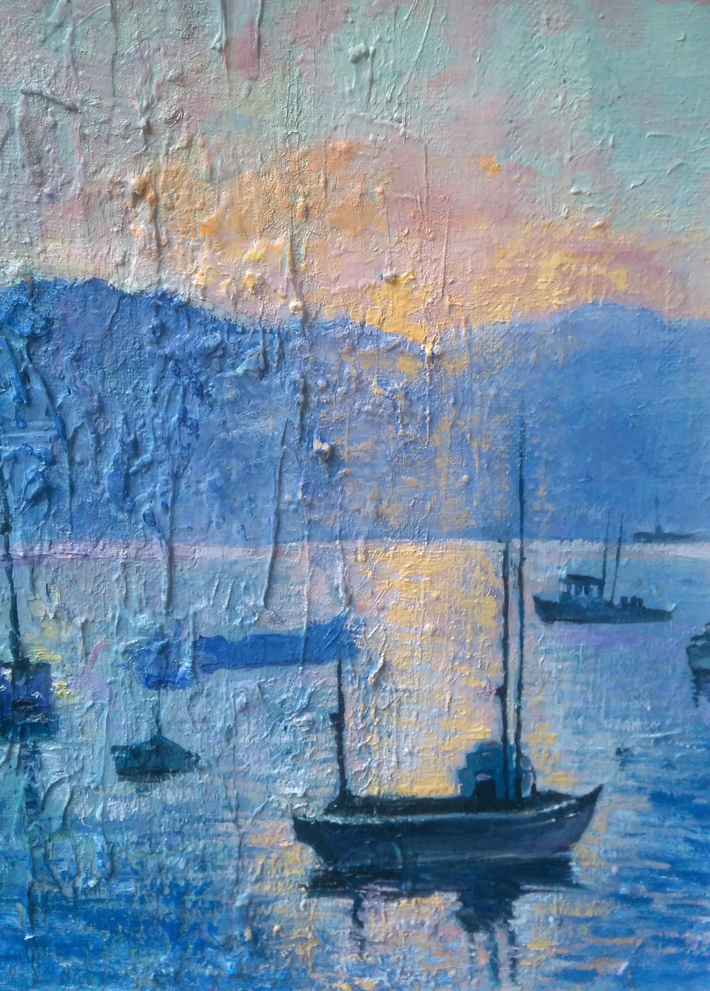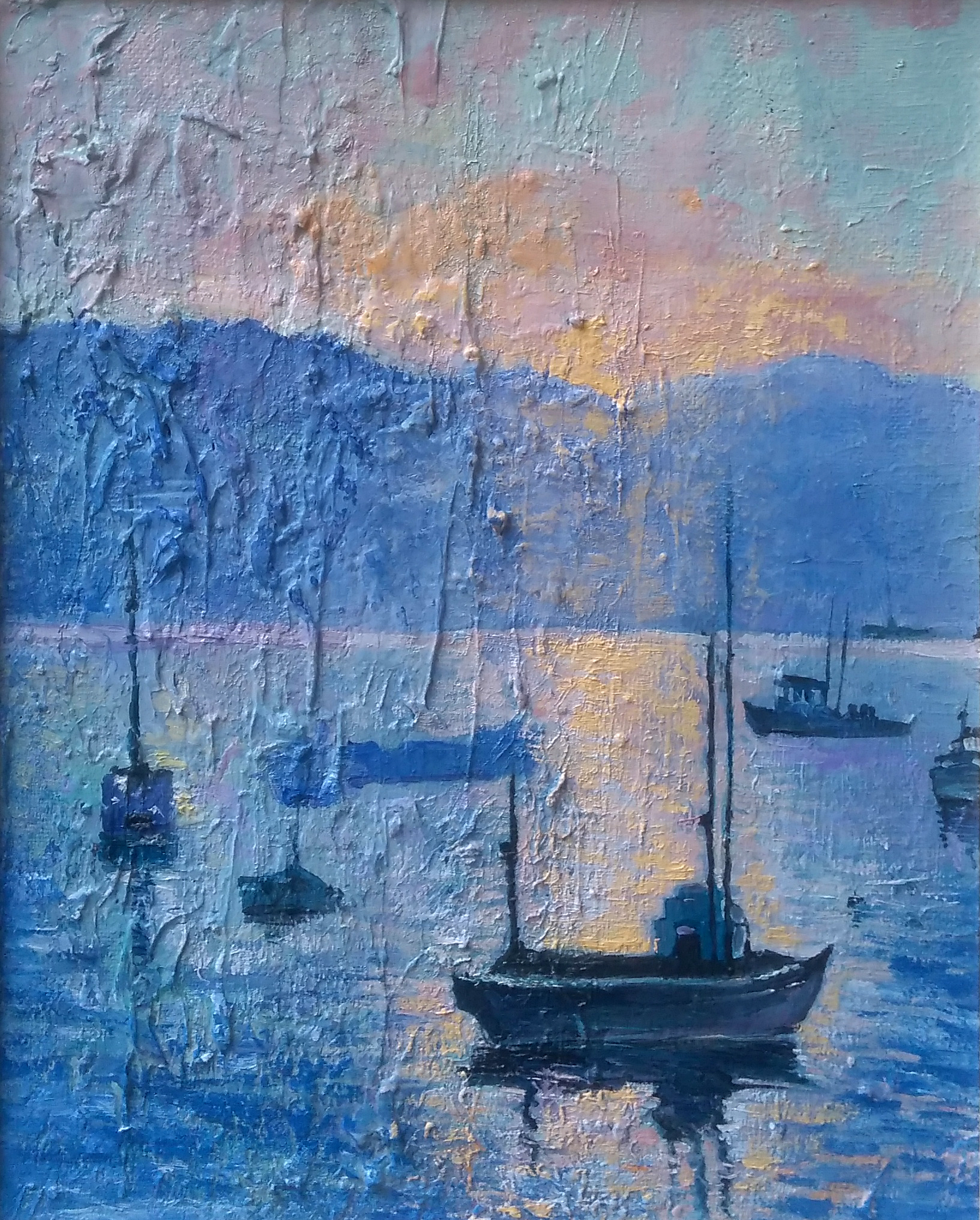 Her landscape paintings appear incandescent, for they turn on and regenerate giving aesthetic form to the energy of nature, with warm and sunny colors between sky, earth, and water, the faces that propose, On the contrary, they denote the restlessness of the human consciousness of every individual depicted as if were tormented by unknown inner forces. Her works have a poetic depth and tangibility, in taking glimpses and angles of view, because she does not stop at the simple visual appearance. She also captures, with movements of lines and figural forms, the magmatic fullness of her vivid and bubbling colors, as if they gushed from the depth of the painted landscapes. These works appear similar to atmospheres full of powerful energies, with which the author is able to express in a suffered way the environmental degradation.
