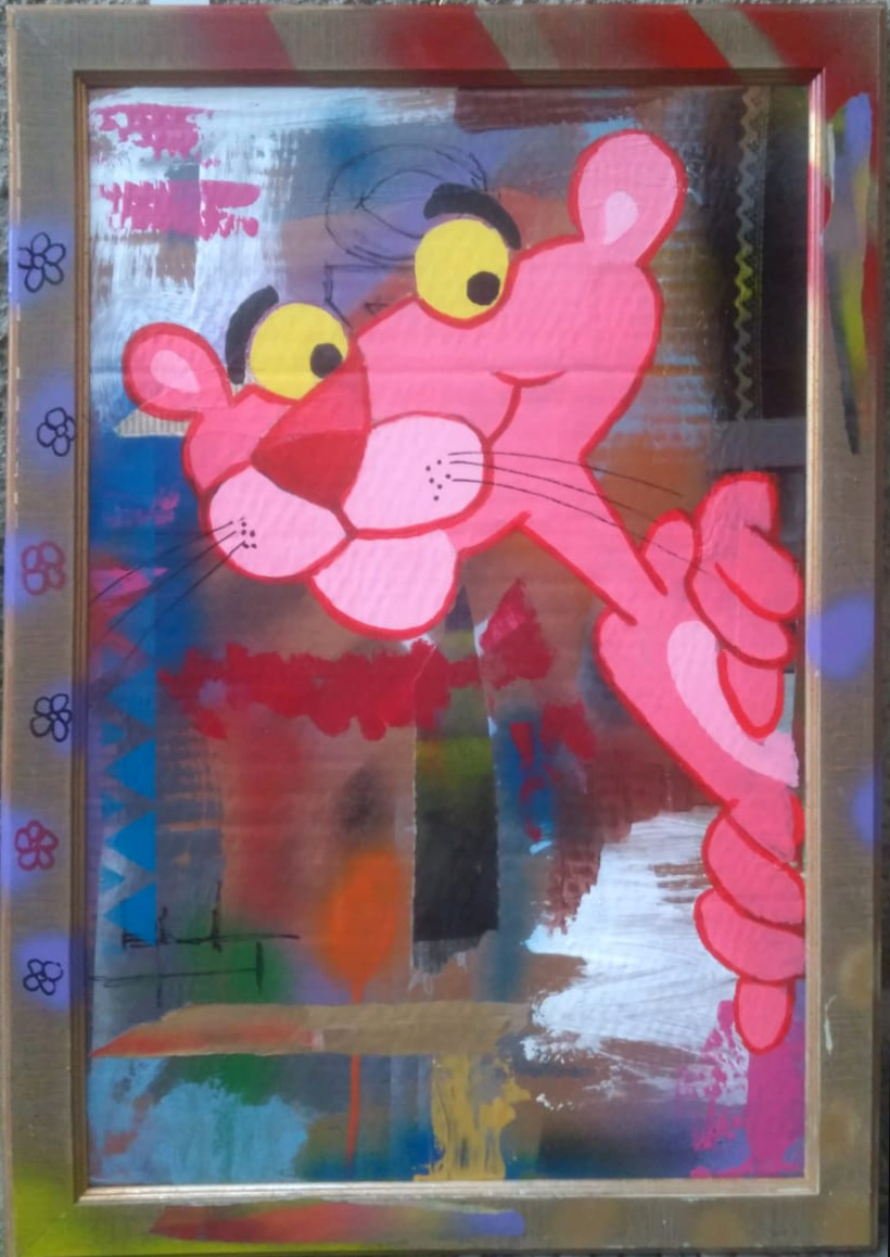 Dipinto ad acrilico e tecnica mista su cartone ondulato, con cornice.